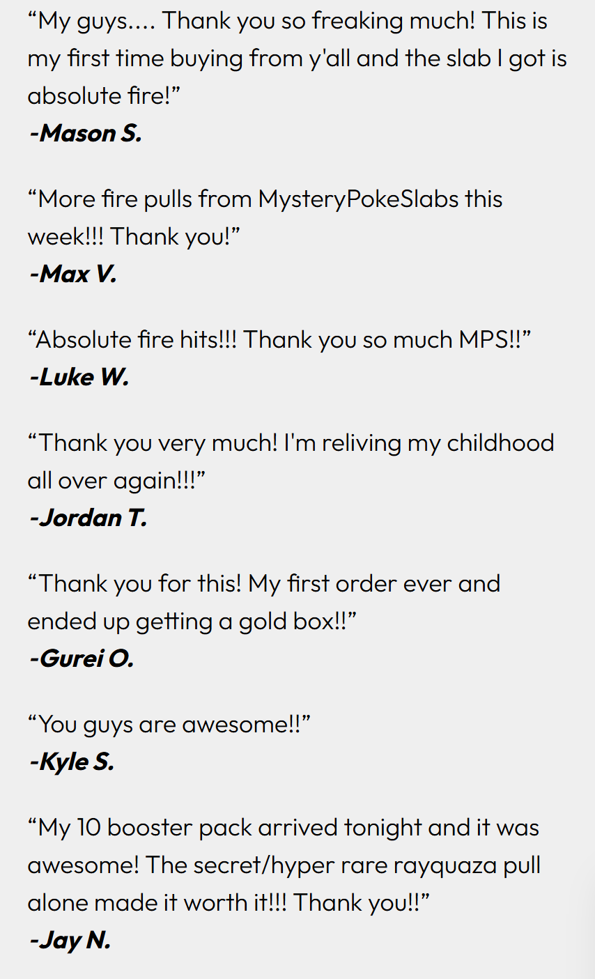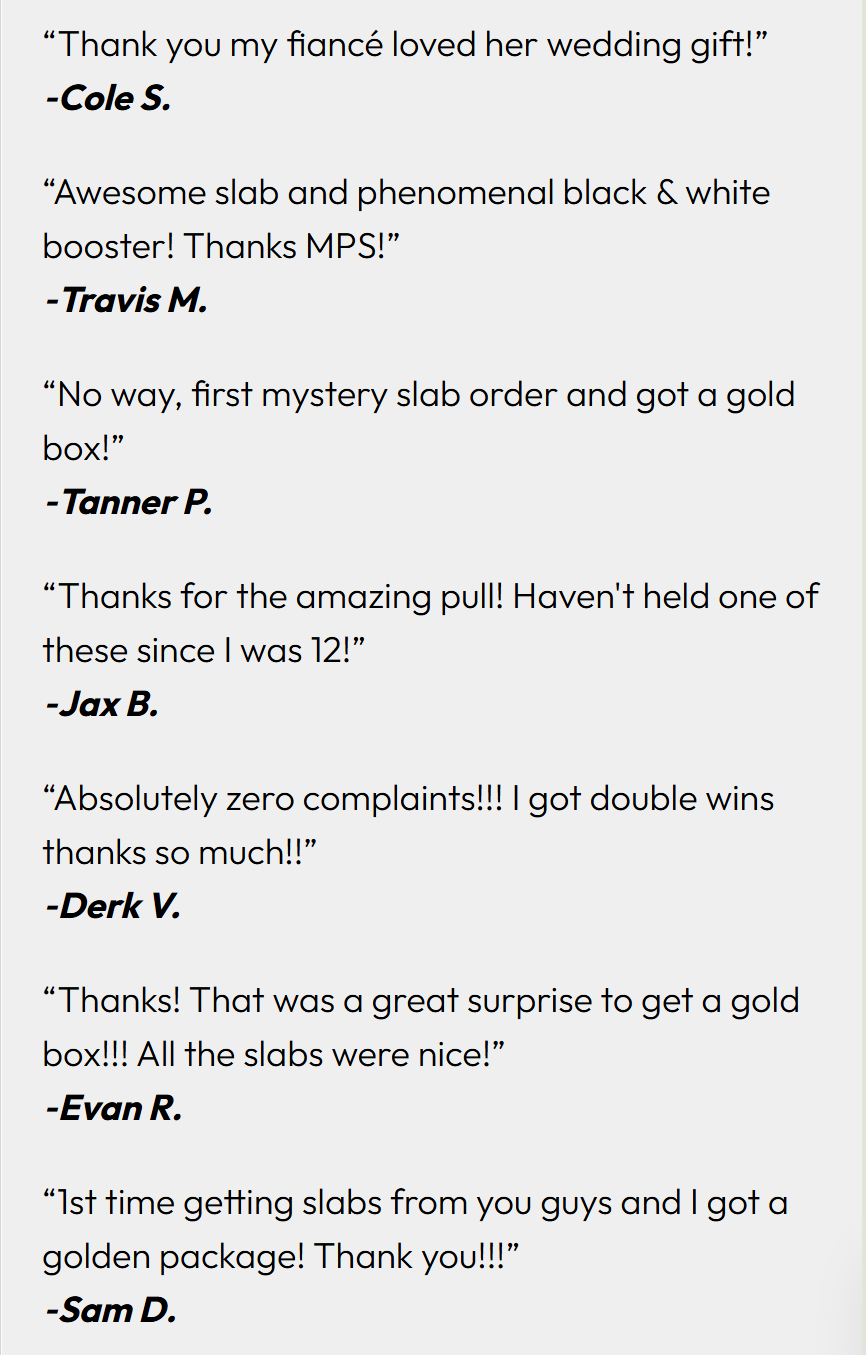 I’ve gotten a handful of slabs from mysterypokeslabs, and I have never regretted it once. Premium cards with every grade being above 8. Love this company